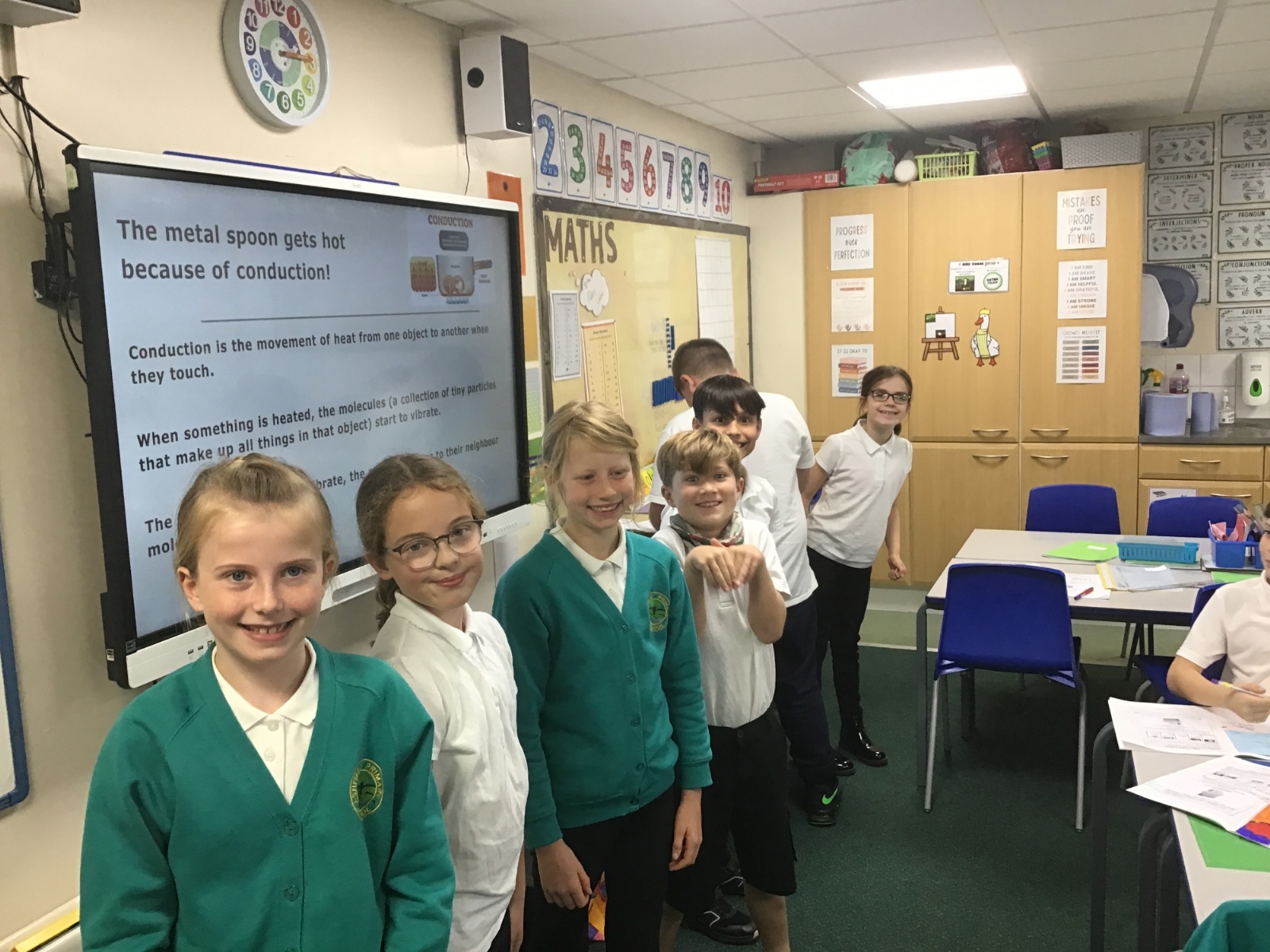 Experiments and demonstrations exploring conductivity of heat and electricity, hardness of materials, solutes, solubility and solvents.